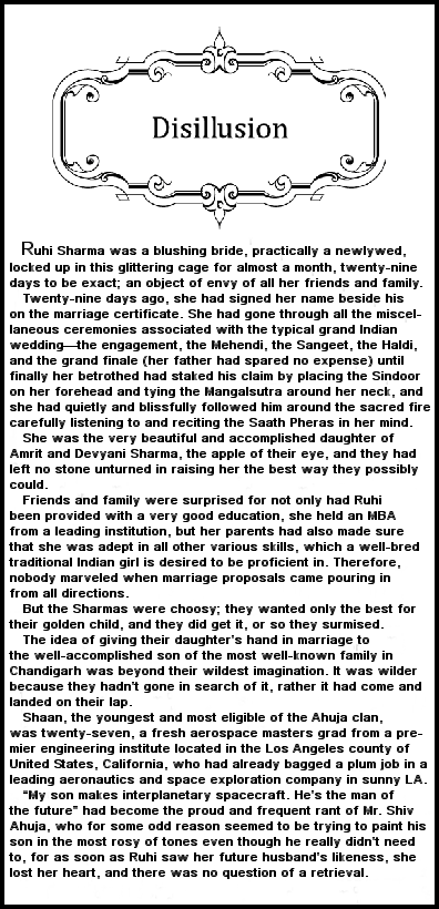 Shaan Ahuja found himself bowing to tradition and agreeing to an arranged marriage to the beautiful Ruhi Sharma. He went through the motions but had no intention of carrying through on his vows. His last foray into matters of the heart with an American girl had left him scarred and unwilling to try again. Thoroughly disillusioned and disgruntled he wasted no time in making his intentions clear to Ruhi on their wedding night. But, he was completely unprepared for what his new wife had in mind.